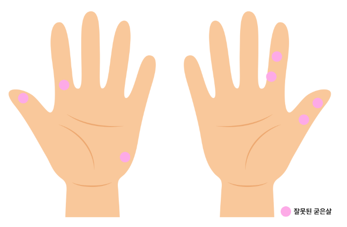 - 왼손 검지 마디: 인터로킹 그립을 사용하는 경우 오른손 새끼손가락과의 마찰로 인해 발생할 수 있는 부위입니다.